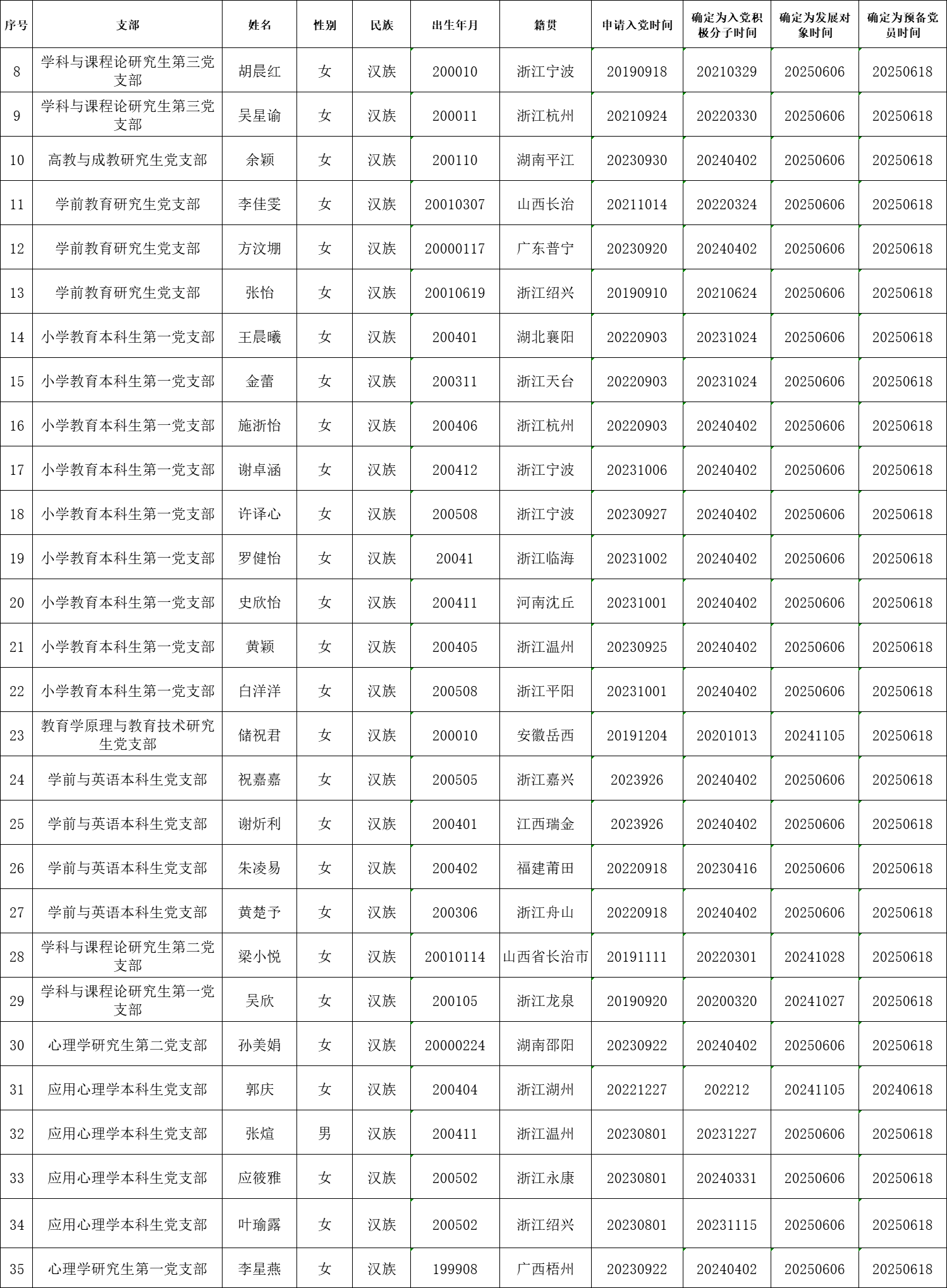 党委会集体审议讨论了张宇等35名同志的接收问题。党委委员共7名,实到会7名。经逐个审议和表决,7名党委委员一致认为张宇等35名同志已具备预备党员条件,同意批准接收为中共预备党员,预备期为2025年6月18日至2026年6月17日。具体名单公布如下: