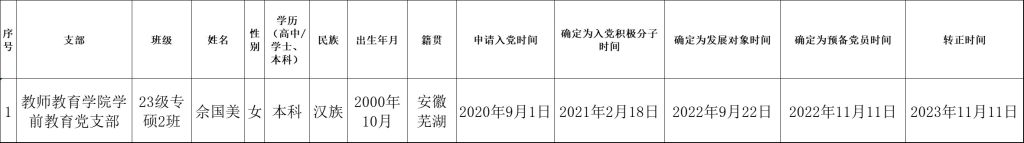 党委会集体审议讨论了佘国美同志的转正问题。党委委员共7名,实到会7名。经逐个审议和表决,7名党委委员一致认为佘国美同志已具备正式党员条件,同意批准按期转为中共正式党员,党龄从预备期满转为正式党员算起。具体名单公布如下: