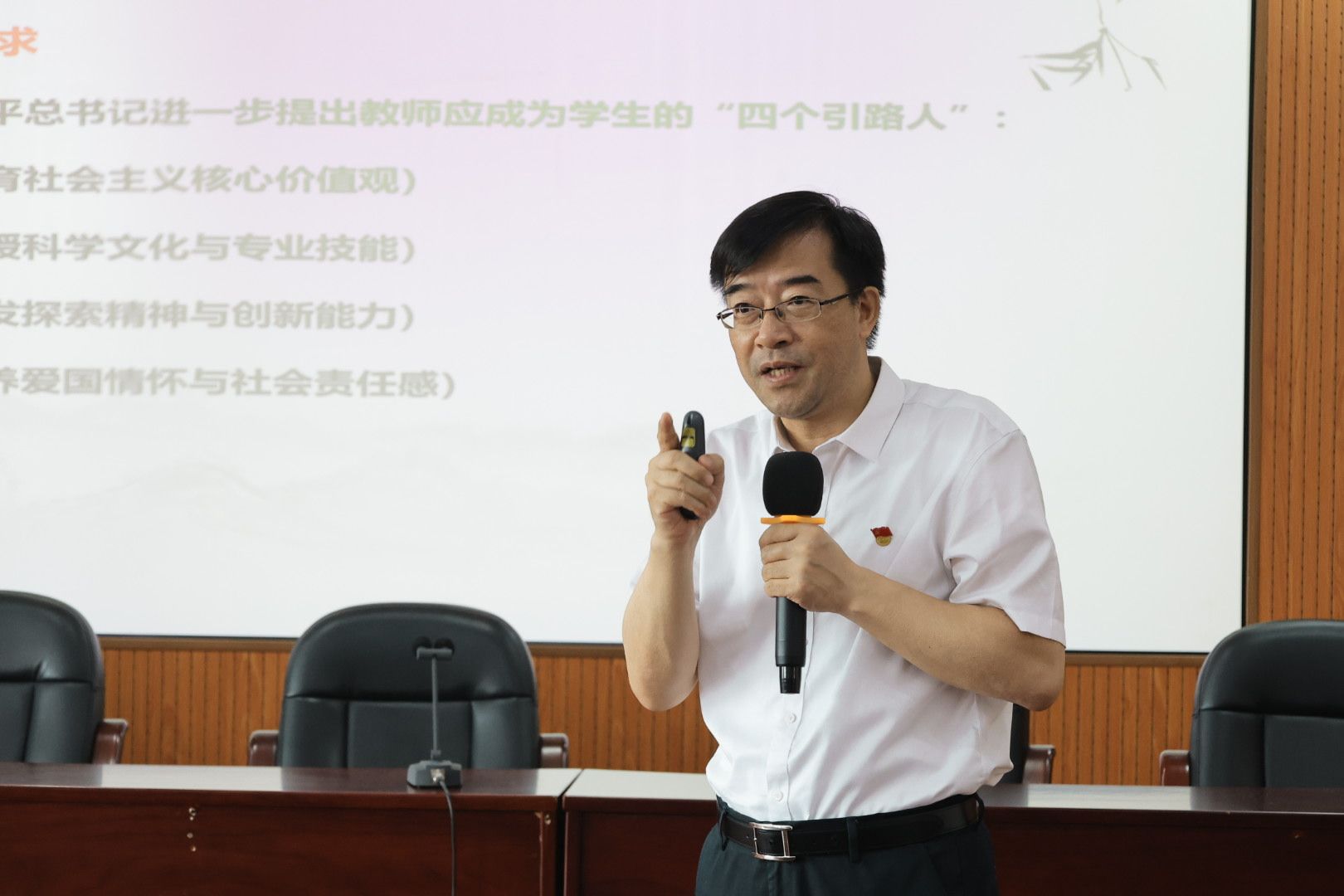 为样本,分享 “为党育人、为国育才” 的落地实践,结合雅教育理念,提出了新教师的使命担当。他提出我们要有“为党育人”的初心使命,要有“儒雅教师”的行为世范,更要有“呵护每一位、发现每一位”的担当意识。我们要为学生“铺好路”“架好桥”,不放弃每一位学生,把学生培养成勇于担当,敢于争先,为社会做贡献的未来社会英才。