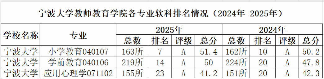 小学教育专业(040107)在全国163所专业中位列第7名(前4.29%),较2024年上升3个位次,总分提升至51.4分,保持A级评级。学前教育专业(040106)进步显著,从2024年的第20名跃升至第14名(前6.39%),在全国219所专业中脱颖而出,总分突破50分,同样获评A级。应用心理学专业(071102)继续保持稳定发展态势,稳居全国前15%行列,保持A级评级,彰显了应用心理学专业建设的稳健性。