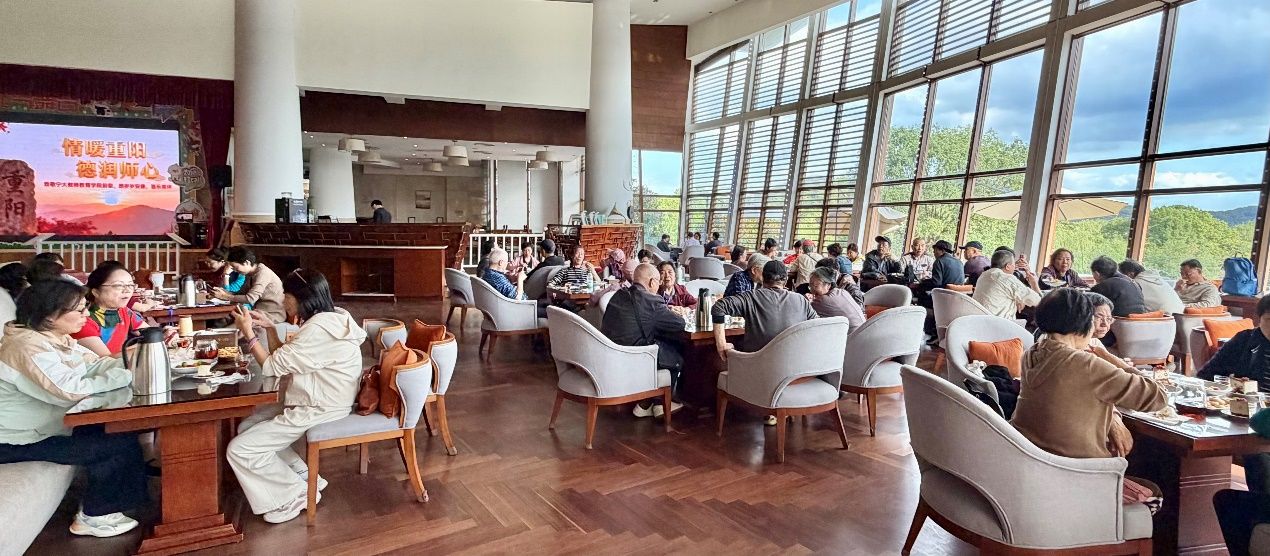 为老教师们安排了可口的午餐,大家围坐一堂,闲话家常,气氛温馨融洽。餐后,队伍前往被誉为“宁波阿勒泰”的秦山村。这里山清水秀,秋色宜人,老师们悠然漫步于山水画卷之中,纷纷拍照留念,记录下这美好的瞬间。