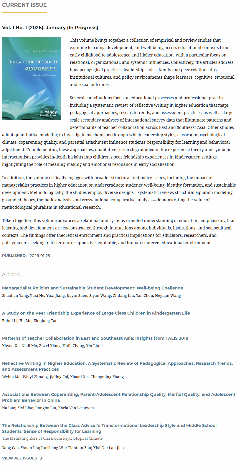 2026年1月29日,由新葡京娱乐城 主办的英文学术期刊《教育研究前沿》(Educational Research Advances)(ISSN: 3106-3632; eISSN: 3106-3624)正式创刊,并出版首期。期刊立足教育研究前沿,聚焦教育理论创新与实践探索的深度融合,致力于打造具有国际影响力的高水平学术交流平台。《Educational Research Advances》由新葡京娱乐城 院长张宝歌教授担任主编,编委会汇聚来自全球高校与研究机构的知名专家学者。其中,瑞典哥德堡大学Kajsa Yang Hansen教授、德国埃尔朗根-纽伦堡大学Michaela Gläser-Zikuda教授,以及新葡京娱乐城 刘鑫副教授、章成铭副教授担任副主编。历经半年多的紧锣密鼓筹备,在国际化办刊理念与多方协同支持下,期刊坚持开放获取(Open Access)与严格同行评议相结合的办刊理念与运作机制,创刊阶段免收文章处理费(APC),并面向全球读者免费开放获取。其中,重点刊载教育政策、教学创新、学习科学、教师发展及跨文化教育等领域的高质量研究成果,旨在促进全球教育研究的知识共建与学术对话,并持续提升新葡京娱乐城 教育学科的国际知名度。目前,期刊官方网站(//era.yandypress.com/)已正式上线,面向全球读者开放获取。未来,《Educational Research Advances》将持续拓展国际学术合作网络,完善学术传播与服务体系,不断提升期刊学术质量与国际影响力,努力建设成为连接中国与世界教育研究的重要学术纽带。《Educational Research Advances》的创办,是新葡京娱乐城 推进教育学科国际化、加强高水平学术平台建设的重要举措,体现了新葡京娱乐城 积极参与全球教育知识体系构建的责任与担当。新葡京娱乐城 诚挚欢迎海内外学者关注并支持期刊发展,踊跃投稿、阅读、审稿与交流等,共同推动教育研究的高质量发展。
