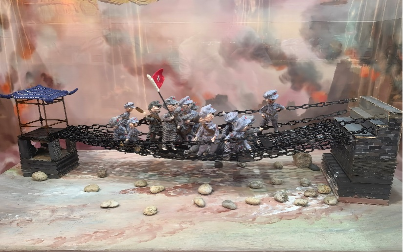 随后,成员们参观了陈辉明钩织工作室作品展。在这里,红军过草地、飞夺泸定桥、狼牙山五壮士、八女投江、巾帼英雄、英雄小八路等历史情景中的人物形象通过钩织技艺被惟妙惟肖地表现出来。其中《飞夺泸定桥》这幅作品更是让我们眼前一亮,作品中的泸定桥为悬挂式铁索桥,全桥由桥身、桥台和桥亭三大部分组成,桥身有13根锁链组成,真实还原了泸定桥原型。红军战士在桥上匍匐前行,生动呈现了"大渡桥横铁索寒"的诗意。队员们也深有感触,在漫长艰苦的革命斗争岁月中,红军战士们身上所体现的正是中国共产党人优秀的品质和崇高的精神风貌,他们永远是我们学习的榜样!