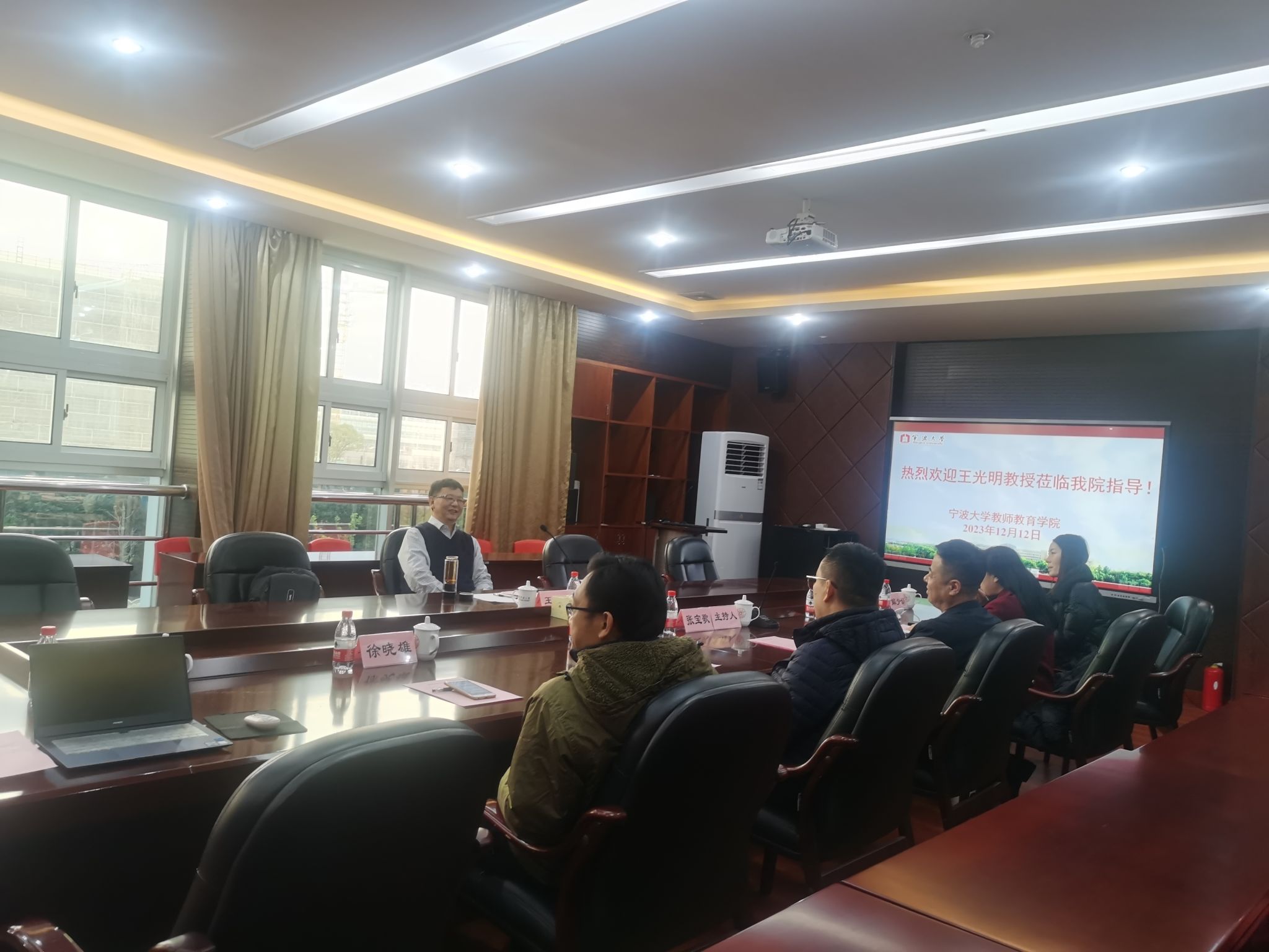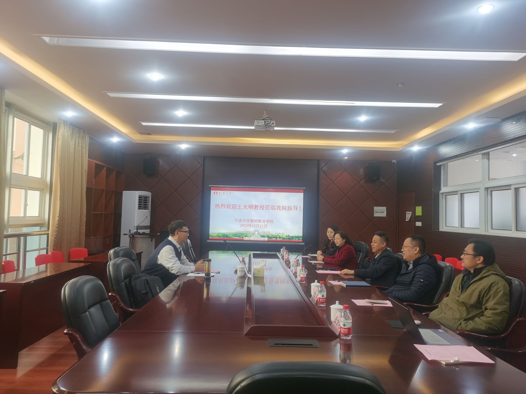 2023年12月12日上午,天津教育科学研究院副院长、教授、博士生导师王光明教授莅临教师教育澳门新葡京网 为学科发展作出指导。张宝歌院长主持会议,副院长刘希伟教授、教育领导与管理研究所所长孙玉丽教授、教育信息化研究所所长徐晓雄教授以及解少娟老师、张会利老师参加会议。