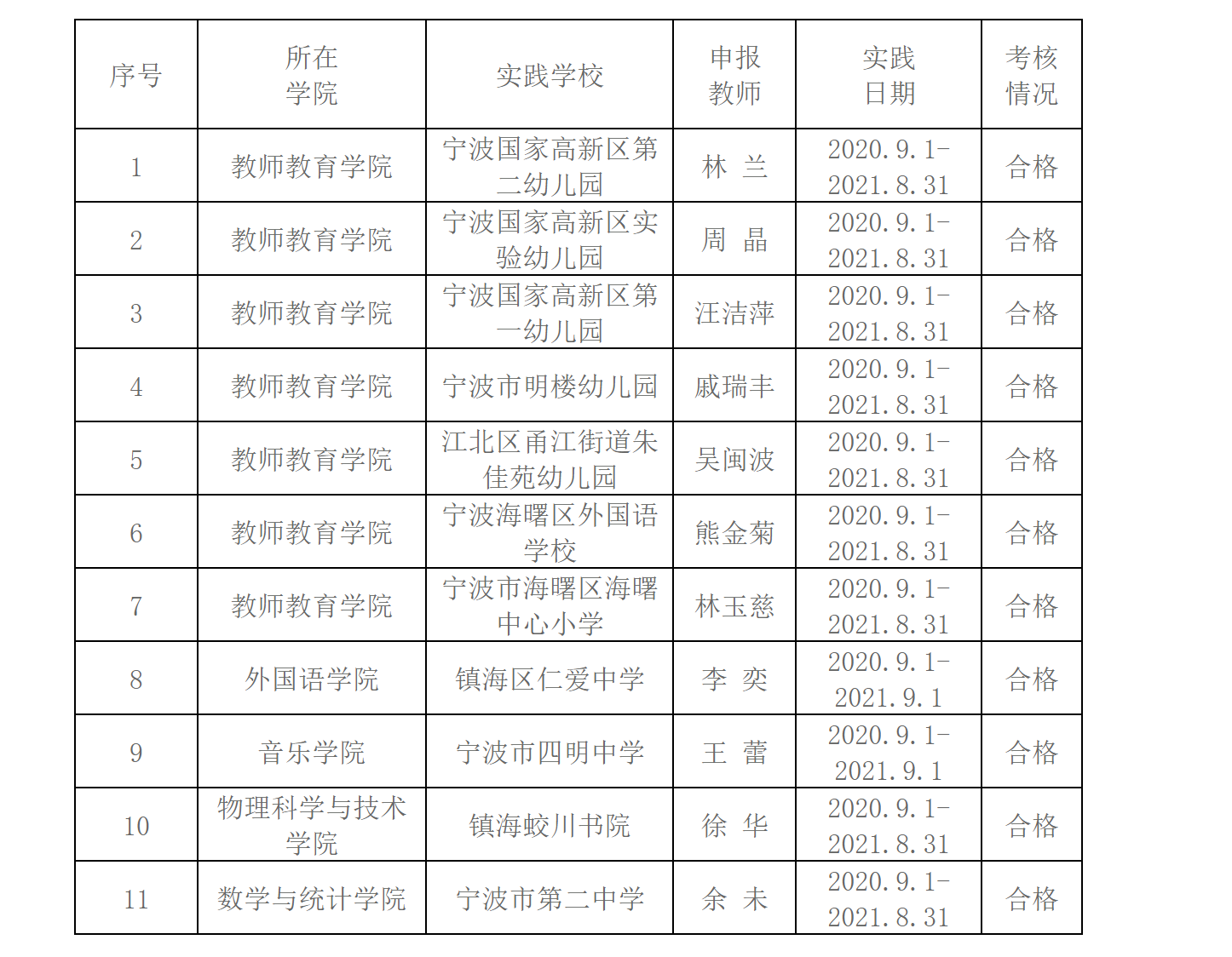 根据《澳门新葡京网 教教师教育实践能力培养实施办法(试行)》(宁大政〔2020〕40号)文件,教务处对2020-2021学年教师教育实践能力培养考核合格的相关人员进行公示,具体名单如下: