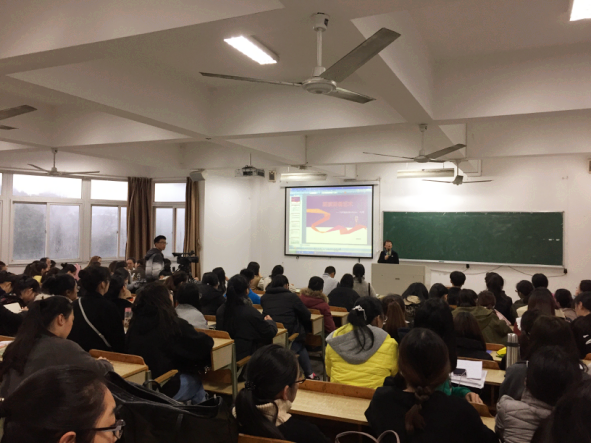 讲座伊始,刘老师先请了今年浙江省大学生汉语口语大赛一等奖获得者俞家敖同学向台下同学们分享他的比赛经历。俞同学为大家分析了汉语口语大赛的比赛流程,使同学们对赛事有了更全面的了解。在讲述备战经历的同时也谈了他的心得,即应先熟背文章,再模仿名人的朗诵,但最重要的还是要将朗诵文章时的情感与自己的亲身经历相融合。随即,现场为同学们朗诵了毛泽东的《沁园春·长沙》,现场气氛十分热烈。