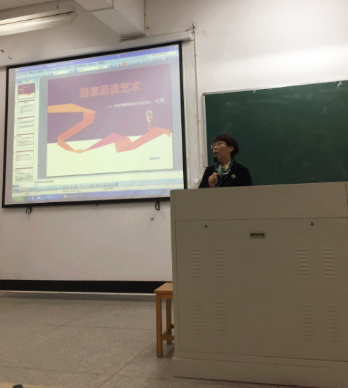 在俞同学向大家分享了他的比赛经历后,刘老师为同学们解读了有关朗读朗诵的艺术。首先,就朗读朗诵的定义、基本要求、大声朗诵(读)的好处做了阐释。其次,刘老师就如何朗读好文质兼美、内涵丰富的中国经典文化,以及规范朗诵(读)条件、发声技巧等方面同同学们做了深入探讨,并就如何对诗词文章的朗诵和解读进行了细致的分析,并提出自己的见解:朗读是“我在”,朗诵是“我是”,朗读者要自始至终记住自我的存在,朗诵者要忘记自我的存在。大家今后作为一名教师,要树立美好的声音形象,要保护好我们的战斗武器——嗓子。随后,刘老师用非常直观的方式对各个等级共十种不同的基调进行了示范对比展示,使同学们对普通话等级的划分有了全新的认识和更深入的了解。刘老师风趣幽默的讲解和声情并茂的示范,使现场师生获益匪浅。