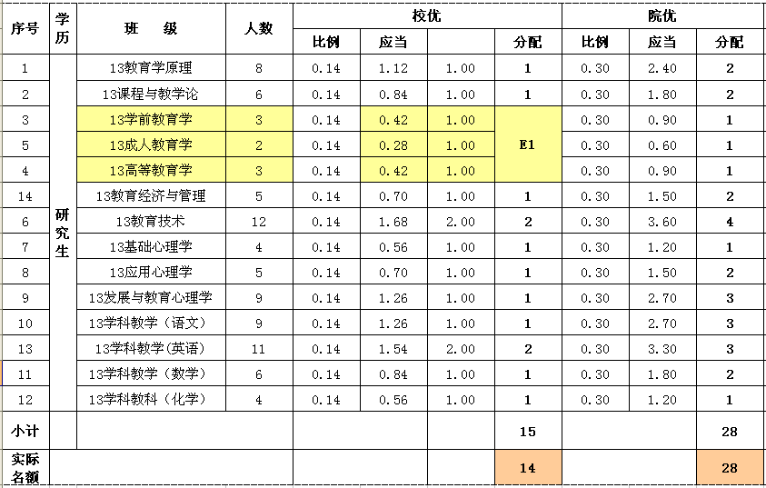 3校优、院优各班名额拟定分配如下: