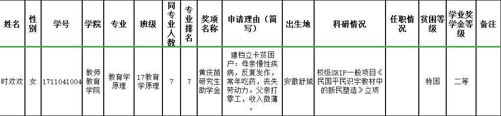 研究生院考虑到新葡京娱乐城 研究生贫困生总量较大,给予新葡京娱乐城 增补一名“绣山清寒优秀学生奖学金”名额。新葡京娱乐城 研究生奖助学金评审委员会办公室根据前期申报情况,拟推荐时欢欢为“绣山清寒优秀学生奖学金”推荐学生,现予以公示。