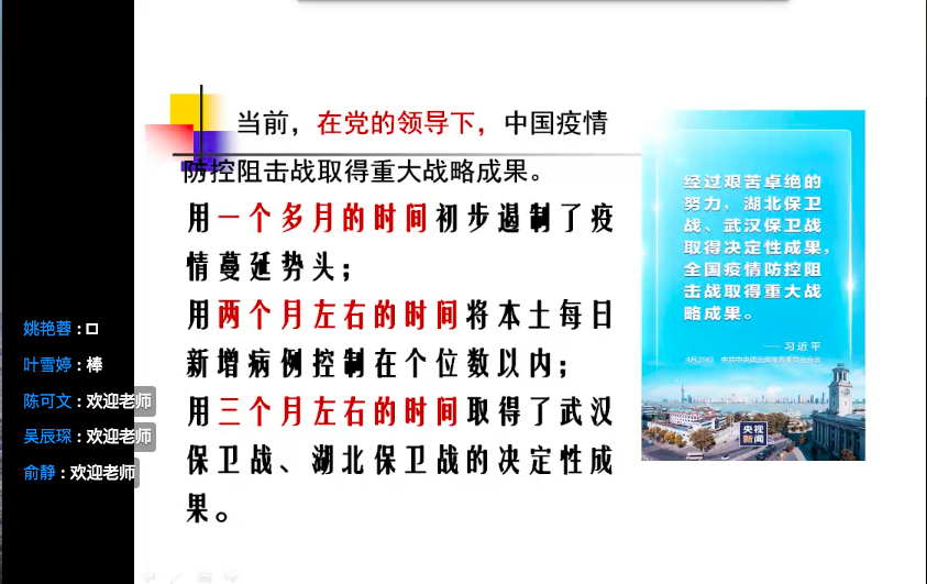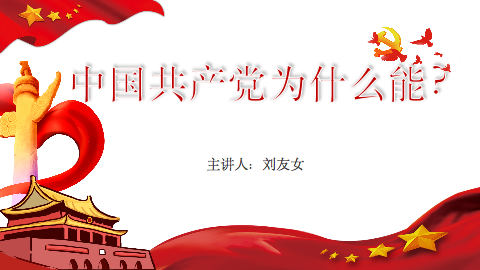 刘友女老师首先带着大家思考:中国共产党为什么能?中国共产党自成立以来,由小到大,从弱到强,团结带领中国人民攻克了一个又一个看似不可攻克的难关,创造了一个又一个彪炳史册的人间奇迹。刘老师结合丰富的历史资料和鲜活的历史实例,告诉大家“中国共产党之所以能,这是历史和人民的选择。”随后,刘老师讲述了在今年抗击疫情面前,在党的领导下,中国疫情防控阻击战取得的重大战略成果,再次证明了中国共产党为什么能。