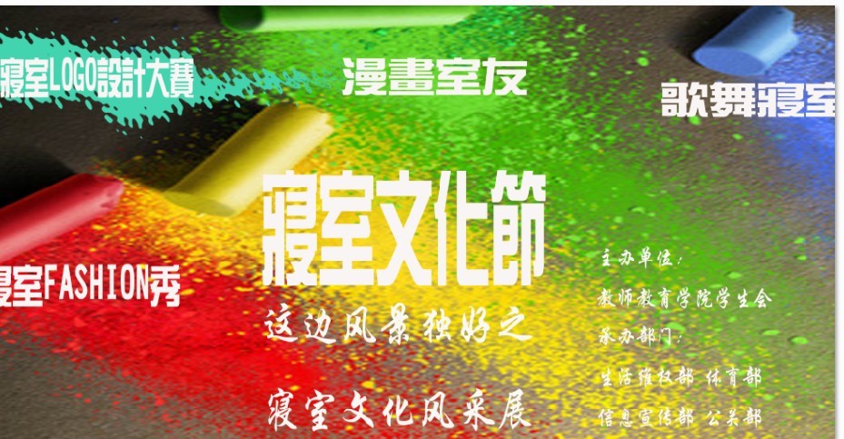 活动内容:十一月的第一周开始,我们将组织设计“寝室Logo大赛”、“漫画室友”、“歌吾寝室”、“寝室Fashion Show”系列活动,每个寝室都参与进来,把最能展现寝室文化、寝室魅力、寝室风采的活动亮化展示出来。最后将活动成果体现在寝室室服上,突出以寝室特色展现寝室文化,以舞台展示的方式突出特色寝室的文化展现。
